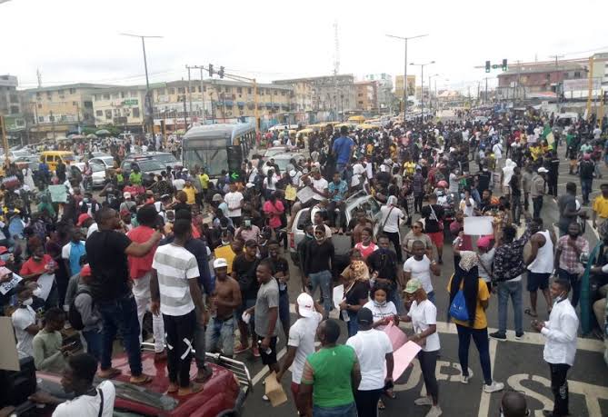 A media crew from the African Independent Television (AIT), deployed to cover the protest escaped death by the whiskers as the protesters upon sighing the crew pounced on them forcing them to abandon their vehicle and run for their lives.